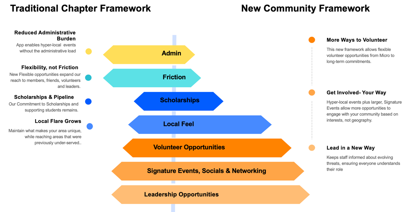 Community is reimagined. Borderless, interest-driven engagement (hubs, member-led meetups, signature events, special interest communities) supported by members in CA Forums, and advisory councils.