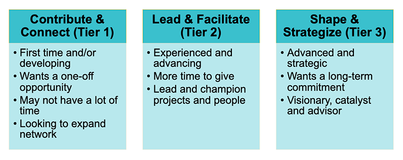 Leadership pathways are evolving. Modern, flexible, customizable, and scalable opportunities replace outdated and one-size-fits all traditional roles. Volunteers can contribute and connect, lead and facilitate, or shape and strategize across the CA-wide model.