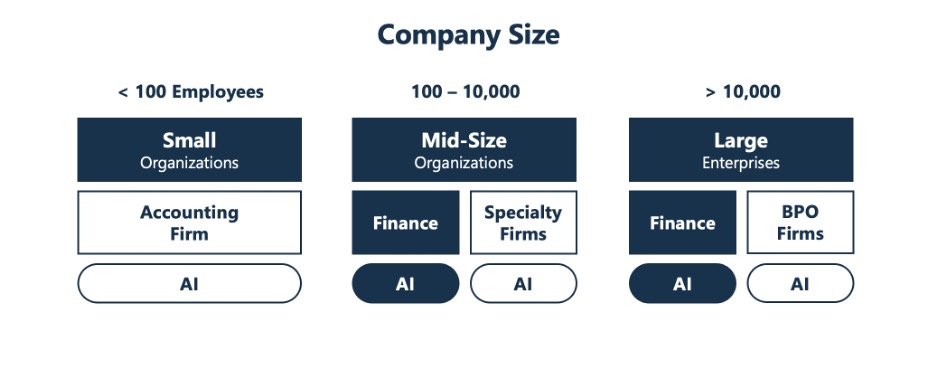 Mid-Size Companies: These organizations maintain internal finance teams for critical functions while leveraging specialty firms for complementary expertise. The recommended approach is to select a comprehensive AI software product for finance process automation while enabling internal teams to build custom solutions using no-code platforms. Mid-size organizations typically lack the scale to justify custom AI development but have sufficient complexity to benefit from integrated solutions beyond point tools.