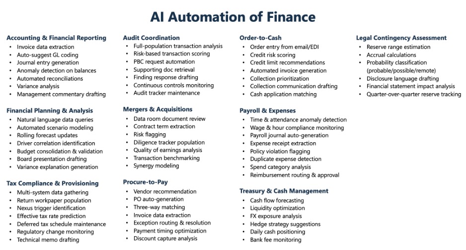 Beyond individual productivity, AI enables the automation of entire workflows across multiple roles within the finance function and across other departments. The following areas represent processes where AI can reliably automate thousands of tasks with minimal human intervention: